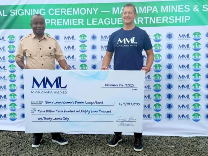 (Left to right) SLFA President Babadi Kamara accepting a cheque from Marampa Mines Limited in support of the Sierra Leone Women’s Premier League